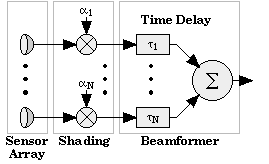 Time-domain beamforming is done by delaying and adding shaded outputs from an array of transducers. The (optional) shading of the sensor outputs is done to improve the spatial response characteristics of the beam, and is roughly equivalent to "windowing" in DSP theory. Each beam is formed by delaying and summing sensor elements. The following block diagram shows how a single beam is formed from N transducers, in an analog beamformer.The delay used for each sensor element is determined by array geometry and the desired MRA. Projecting the elements onto a line which is perpendicular to the beam's MRA gives a distance for each element. This distance (divided by the speed of sound) gives the delay required to form the beam at the desired MRA.