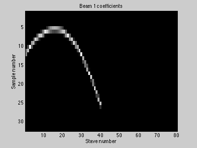 In a digital implementation, we sample these elements at a rate just above the Nyquist criterion. Although this preserves the frequency content of the signal, this does not give enough steering delay resolution. Digital interpolation is performed, increasing the steering-delay resolution by a factor of L. Now time delays are quantized to integer sample delays.In this example we use unity shading, and simply interpolate across two samples. As a result, all coefficient values are between zero and one. The figure below plots these values, where white is one and black is zero. Non-zero coefficients are extremely sparse, allowing efficient implementation. Note that each "picture" contains the values required to calculate one sample of one beam output.