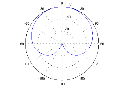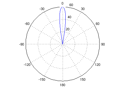 The response of a given element is plotted on a polar graph, where the angle is the offset from the MRA, and the radius is the magnitude response (dB) in that direction. Element responses (determined by the 3dB down point) are very wide -- in this example the width is about 90 degrees.The goal of beamforming is to sum multiple elements to achieve a narrower response in a desired direction (the MRA). That way when we hear a sound in a given beam, we know which direction it came from. Real implementations introduce things such as nulls and sidelobes, which we won't discuss here.