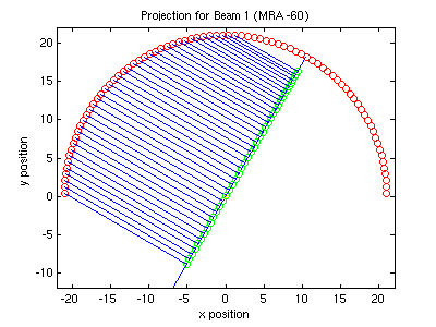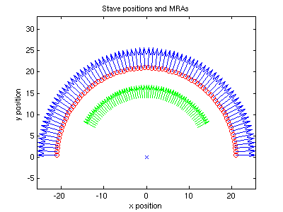 A beamformer is a spatial filter that operates on the output of an array of sensors in order to enhance the amplitude of a coherent wavefront relative to background noise and directional interference. The figure below shows a curved array of hydrophone sensors, or staves. Each sensor (red circle) is located at an (x,y) coordinate as shown. These sensors are pointed in known directions (blue arrows), and we wish to form beams which point in chosen directions (green arrows). The "pointing direction" is called the Maximum Response Angle (MRA), and can be arbitrarily chosen for the beams.