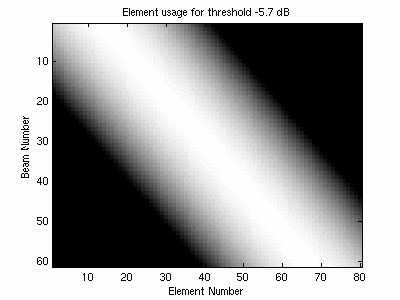 It doesn't make sense to use elements which point in the wrong direction. In the following plot, any element which is some fixed threshold below its maximum is zeroed out. Now we're only using the non-zero elements to form each beam. This step saves on processing, with minimal beam degradation.