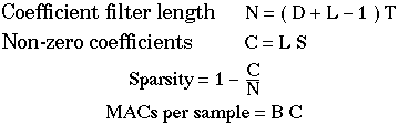 The FIR filter length, N, can be extremely long -- in our example it is 2560. However, the number of non-zero coefficients is only 100, for a sparsity of 96%. As a result, 6100 multiply-accumulates (MACs) are required per sample. At high-frequency sonar sample rates, we are approaching one billion MACs per second.