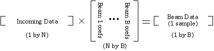 If multiple samples of the entire sensor array are stored contiguously in memory, then each beam's coefficients can be represented by a FIR filter of length N = (D+L-1)T. Now the entire beamforming operation (for one sample of B beams) can be represented by a single operation: