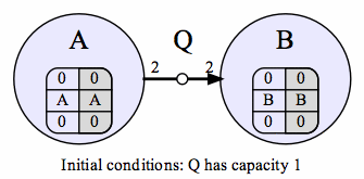 The second example is more complicated, and illustrates an artificial deadlock containing 3 nodes. Queue Q must grow to size 2 before the program can function normally. Again, this example demonstrates that this problem is detected and resolved.