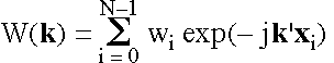The array pattern is essentially the Fourier transform of the receiver weighting function wi, taking into account the positions xi of the receivers. The function W(k-ko) indicates the attenuation of a plane wave propagating in the direction a when the beamformer is steered in the direction ao.