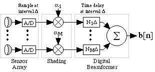These quantization errors in the time delay perterb the array pattern. In general, the sensors must be sampled at a rate much greater than the Nyquist rate to approximate the time delays required for beam steering. To handle the high bandwidth and large number of elements needed for high resolution sonar, the necessary sampling rate is quite large. These high sampling rates impose requirements on the A/D converters and on the bandwidth of the cables which connect the A/D converters to the beamformer. Large amounts of memory are also required to handle the long delays associated with large arrays and high sample rates. Because of the high implementation cost, digital interpolation beamformers are generally used instead.