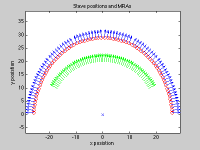 A beamformer is a spatial filter that operates on the output of an array of sensors in order to enhance the amplitude of a coherent wavefront relative to background noise and directional interference. The figure below shows a curved array of hydrophone sensors, or staves. Each sensor (red circle) is located at an (x,y) coordinate as shown. These sensors are pointed in known directions (blue arrows), and we wish to form beams which point in chosen directions (green arrows). The "pointing direction" is called the Maximum Response Angle (MRA), and can be arbitrarily chosen for the beams.