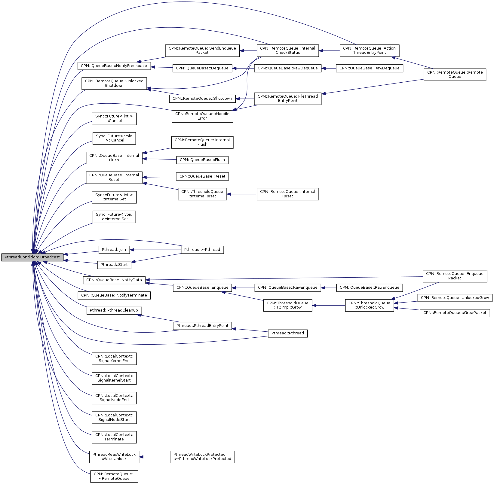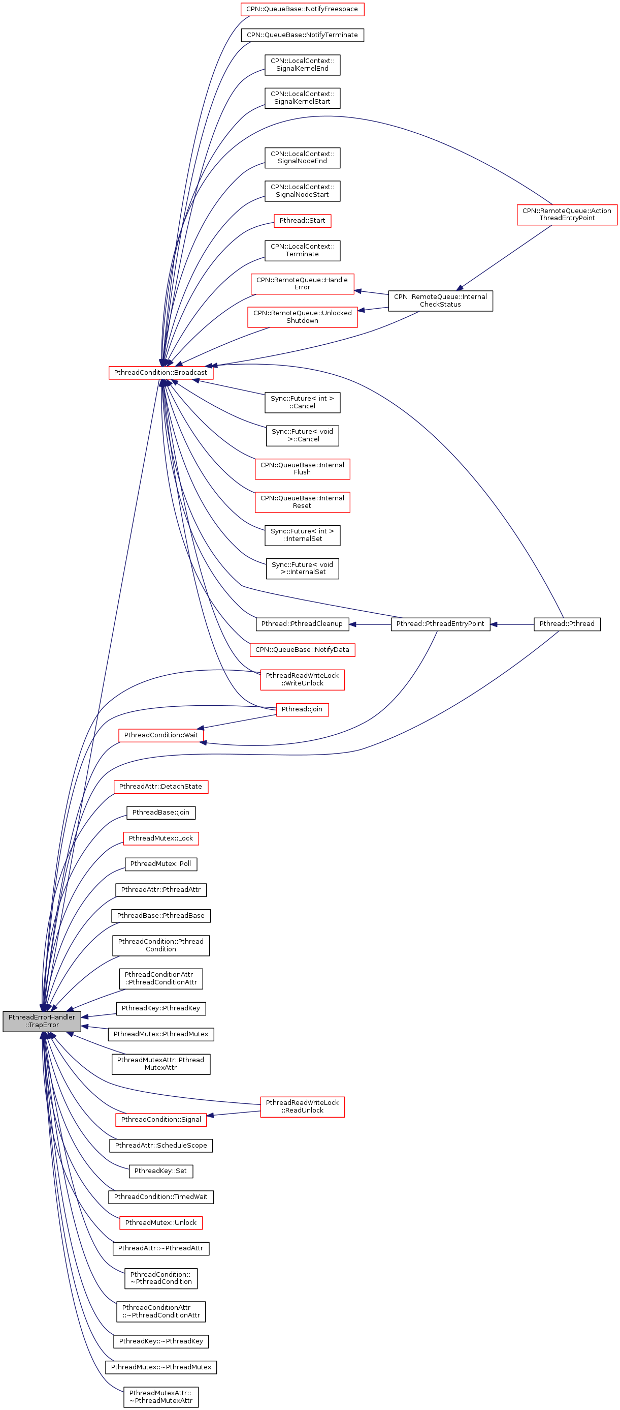 Referenced by CPN::RemoteQueue::ActionThreadEntryPoint(), Sync::Future< int >::Cancel(), Sync::Future< void >::Cancel(), CPN::RemoteQueue::HandleError(), CPN::RemoteQueue::InternalCheckStatus(), CPN::QueueBase::InternalFlush(), CPN::QueueBase::InternalReset(), Sync::Future< int >::InternalSet(), Sync::Future< void >::InternalSet(), Pthread::Join(), CPN::QueueBase::NotifyData(), CPN::QueueBase::NotifyFreespace(), CPN::QueueBase::NotifyTerminate(), Pthread::Pthread(), Pthread::PthreadCleanup(), Pthread::PthreadEntryPoint(), CPN::LocalContext::SignalKernelEnd(), CPN::LocalContext::SignalKernelStart(), CPN::LocalContext::SignalNodeEnd(), CPN::LocalContext::SignalNodeStart(), Pthread::Start(), CPN::LocalContext::Terminate(), CPN::RemoteQueue::UnlockedShutdown(), PthreadReadWriteLock::WriteUnlock(), Pthread::~Pthread(), and CPN::RemoteQueue::~RemoteQueue().