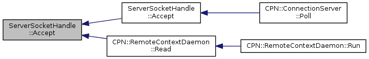 Here is the caller graph for this function:| int ServerSocketHandle::Accept | ( | ) |