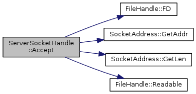 Here is the call graph for this function:| int ServerSocketHandle::Accept | ( | SocketAddress & | addr | ) |